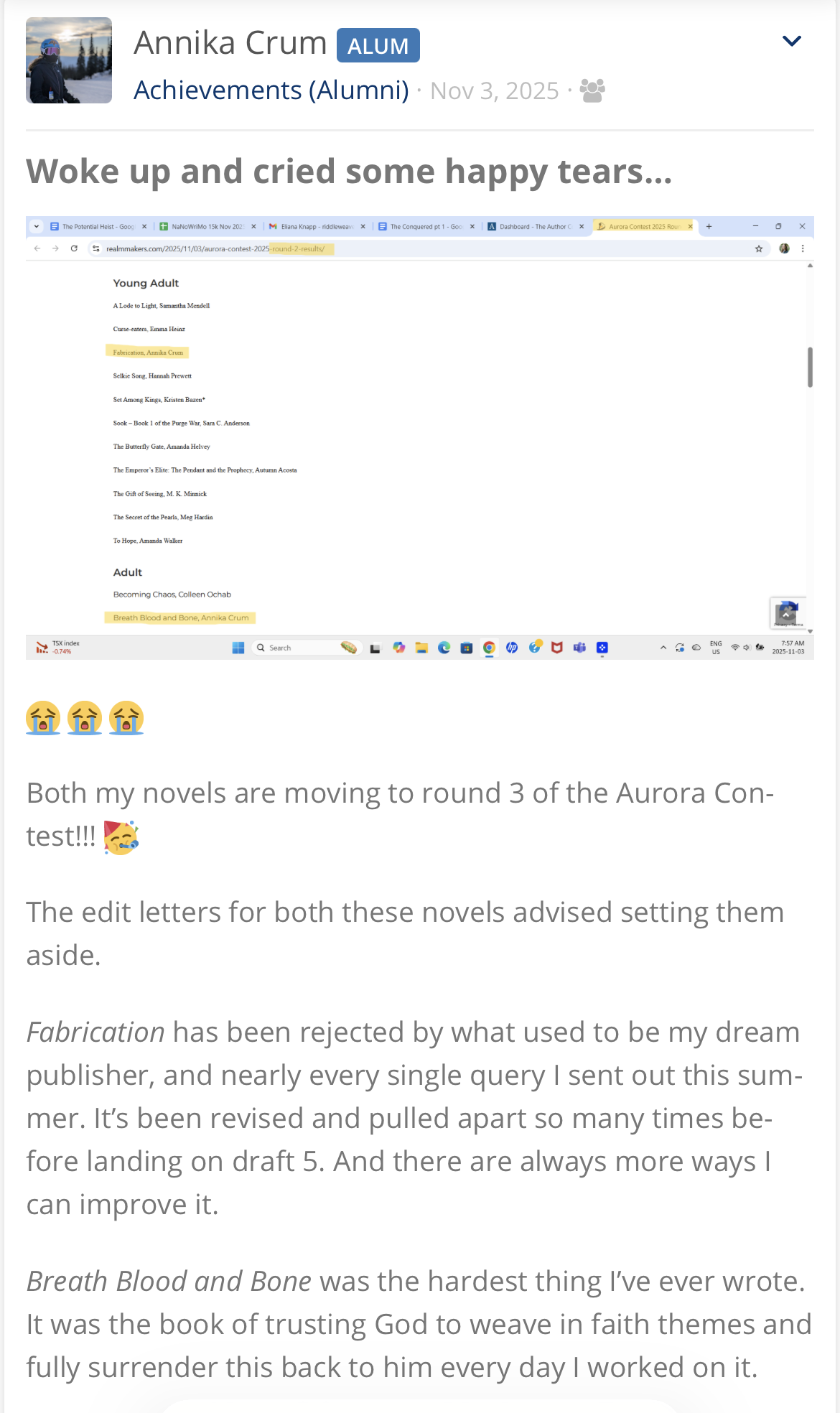 - Annika C had two novels move onto the third round of the Aurora Contest